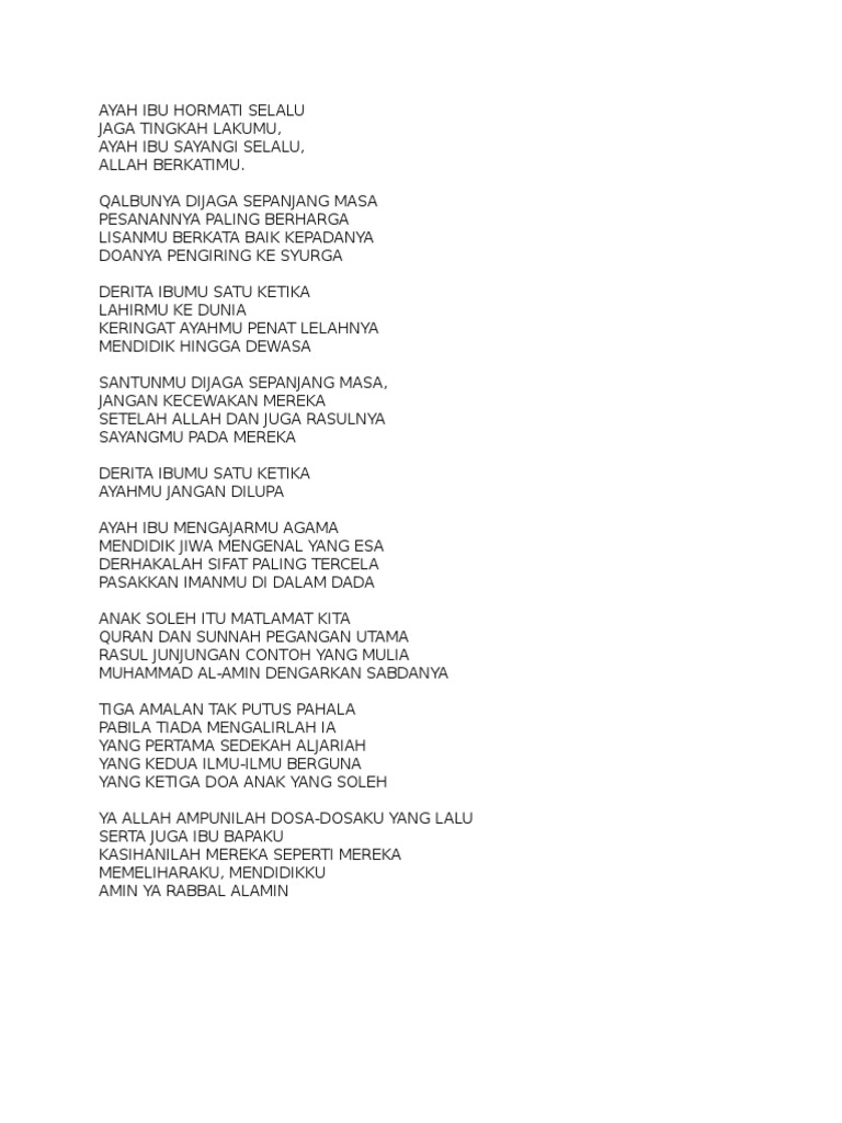 Oh ayah ibu Cobalah kau dengarkan Akan ku jagamu Ke hujung hayatku Berbakti padamu Oh ayah ibu ku ku menyayangimu ku mencintaimu ku mengasihimu Seumur hidupku Lirik Lagu Yang Terkait. Akan Ku jagamu ke hujung hayatku. Ku Mengasihimu seumur hidupku.